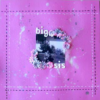 Big Sis Layout. This page is for the Monochrome Challenge and the Heritage Challenge over at scrapbook.com. The Monochrome Challenge for week 4 was to use Mauve with the twist of 5 fibers. I did not do the twist since my stash is not well-stocked in the mauve category. The heritage challenge was to use photos from 1960 or before and to scraplift one of you favorite layouts. I chose {Puppet}'s Just Me layout. I used about the only page of mauve paper I had which is embossed and misted the paper with Lindy's Stamp Gang Mist in Ghouly Gargoyle White and Tattered Angels' Slate. The flowers were misted with the same mists with the addition of some Distress Ink Worn Lipstick mist I made myself. The photo is of my Aunt Esmeralda with my Uncle Joe (late 50's). She was and is such a good big sister.